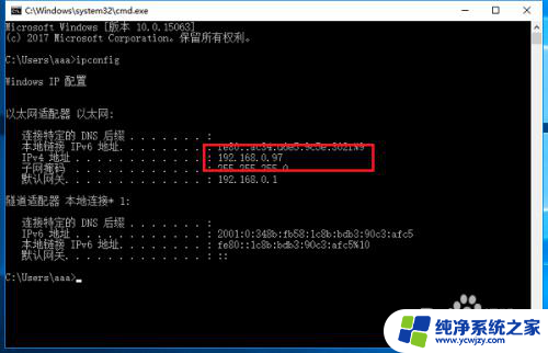 2.第二步进去命令提示符之后,输入ipconfig,如下图所示: