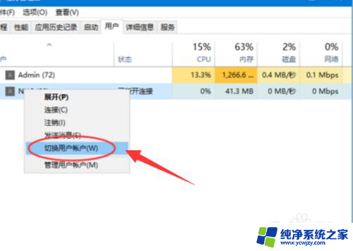 2.然后再将鼠标指向切换登录用户右击任务栏,进入任务栏管理器接着找到任务栏管理器,用户选项卡切换登录账号。选择其他登录的用户然后点击切换,输入其他账号的用户名和密码即可