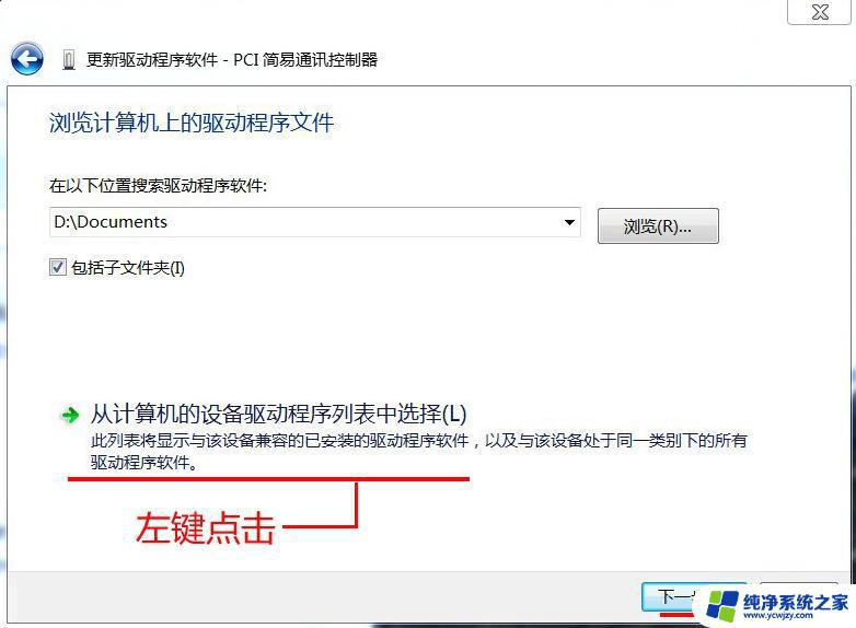 4、我们在下一个更新驱动程序软件-PCI简易通讯控制器窗口点击:从计算机的设备驱动程序列表中选择,再点击:下一步;