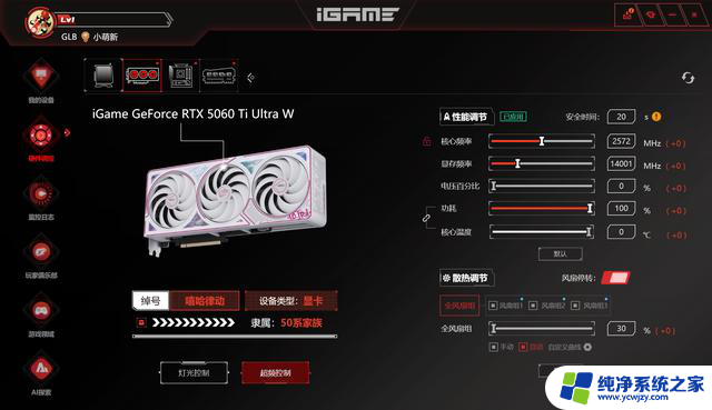 灯光效果,这里我选择了整机同步白色的光效。这张iGame RTX 5060Ti Ultra W OC显卡侧面有iGame Ultra字样部分支持灯光效果,整体看上去很有图腾设计的感觉。